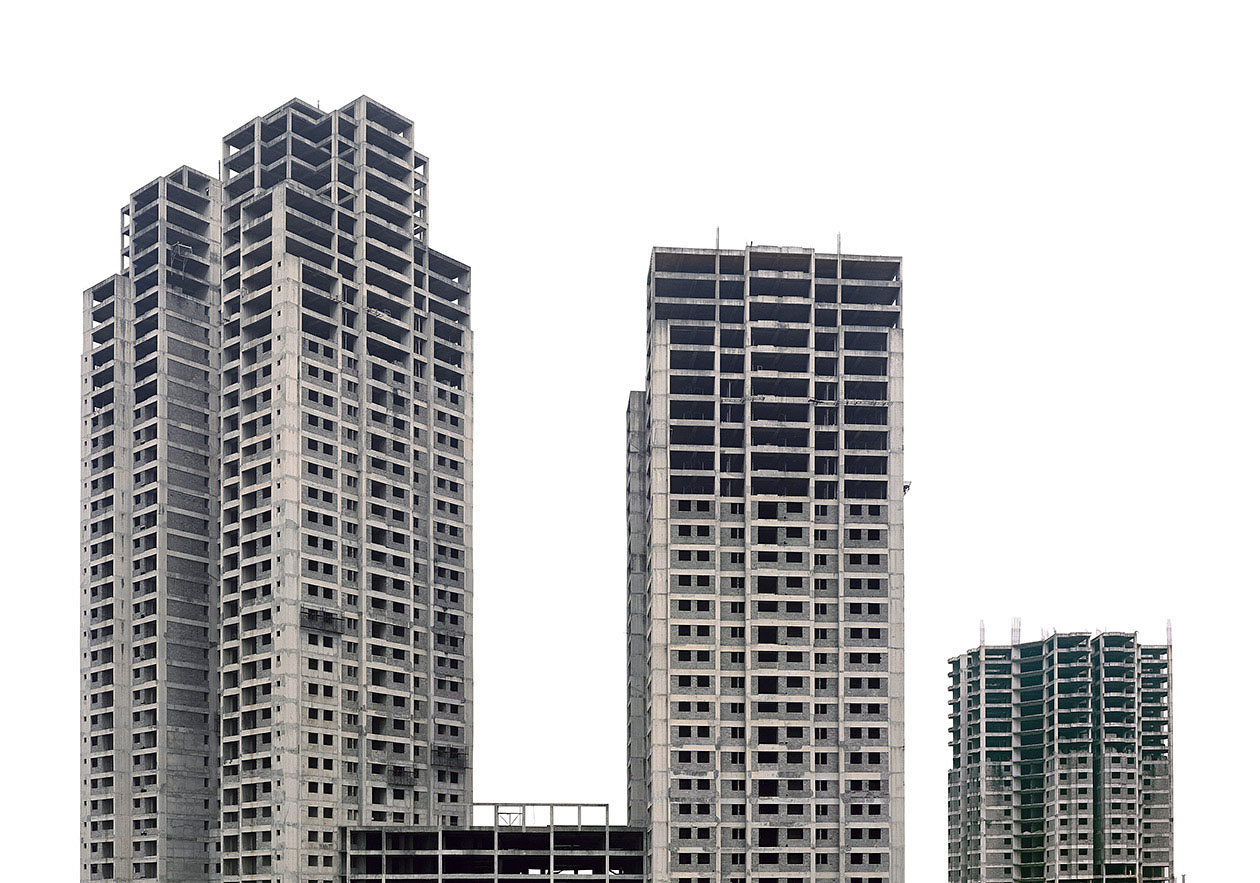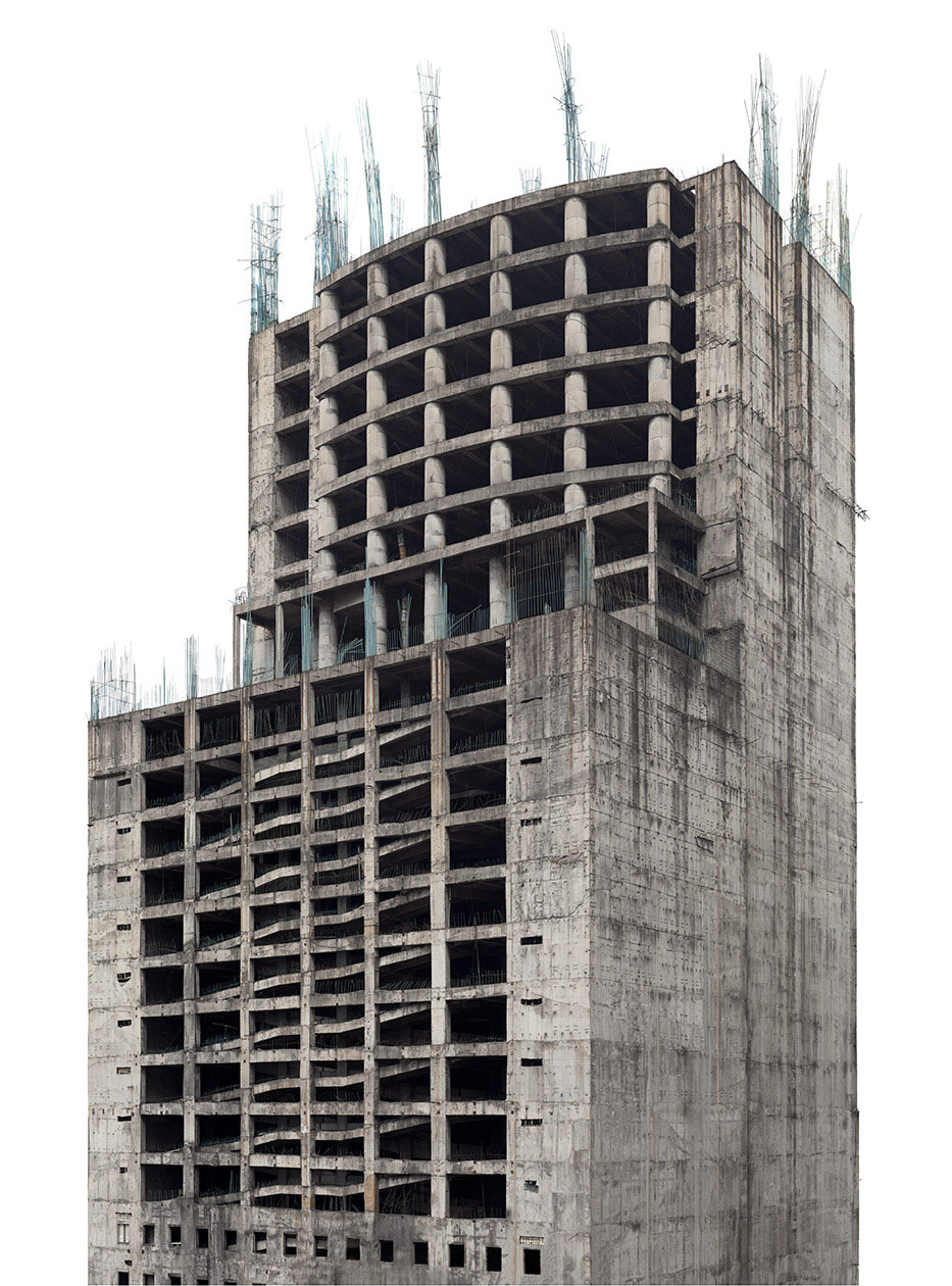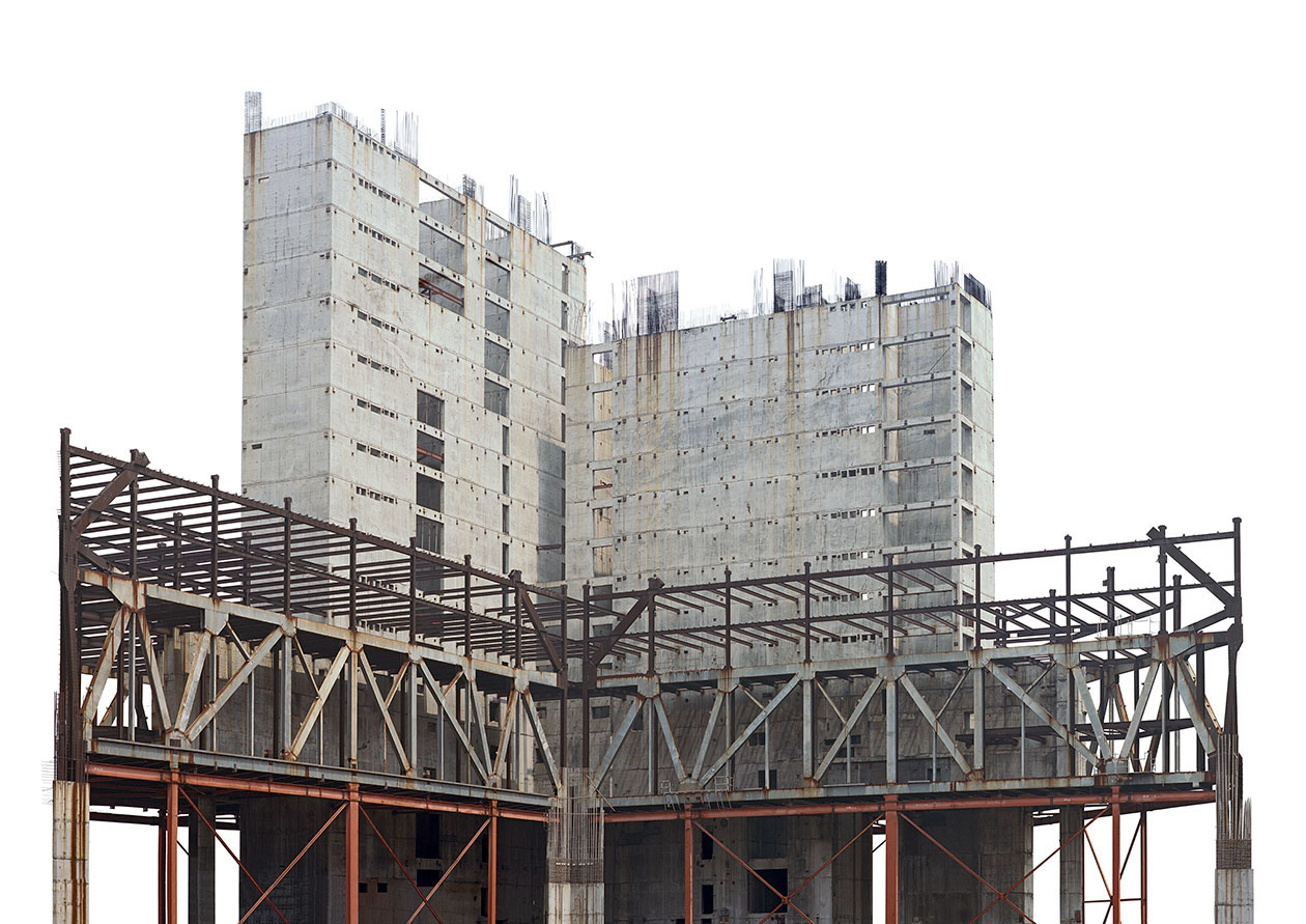 In der vorliegenden Serie verweisen Gebäude jedoch eher auf das Gegenteil. Sie sind groß und zunächst einmal beeindruckend, – bleiben aber unvollendet und erinnern an moderne Ruinen.