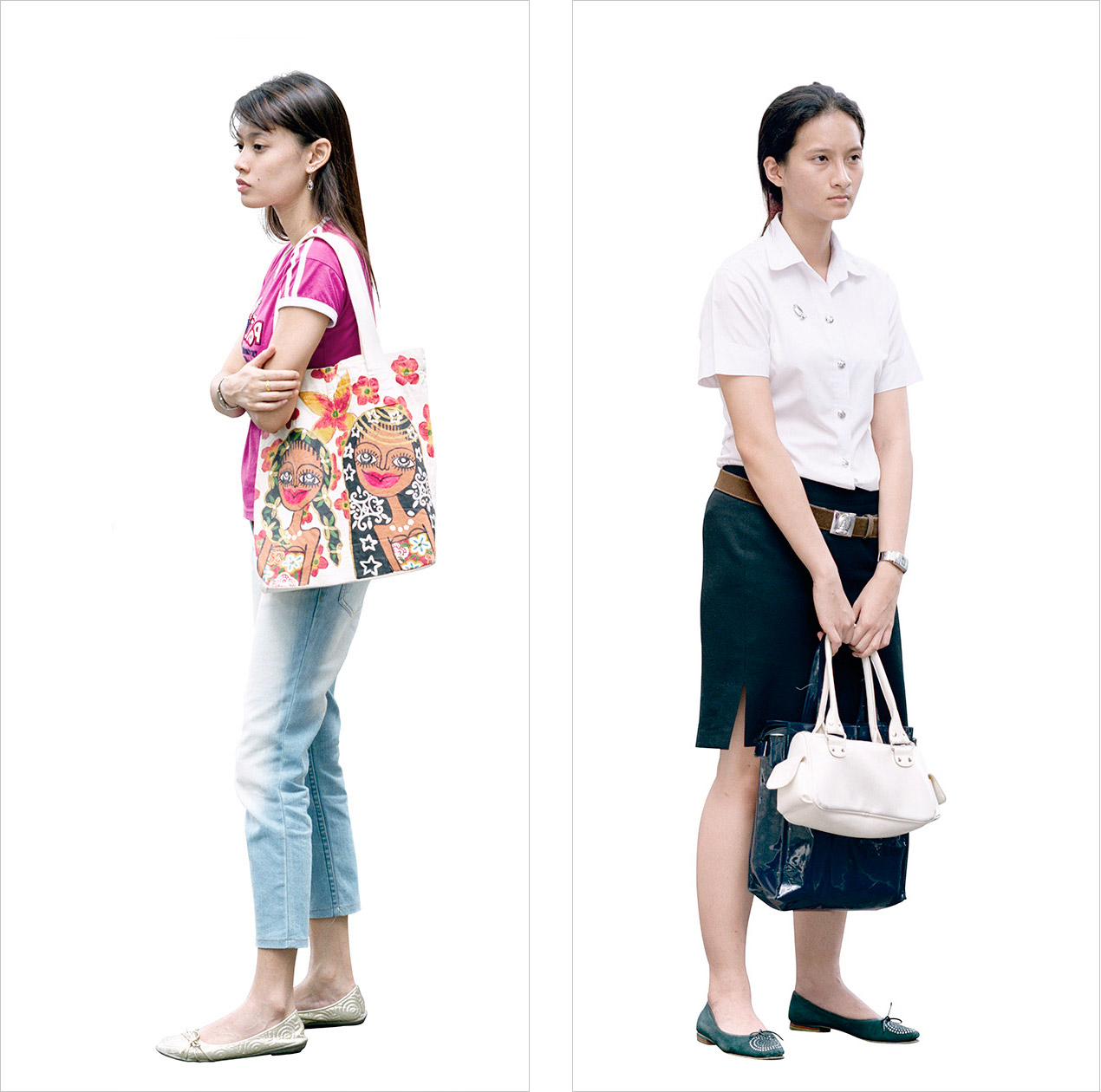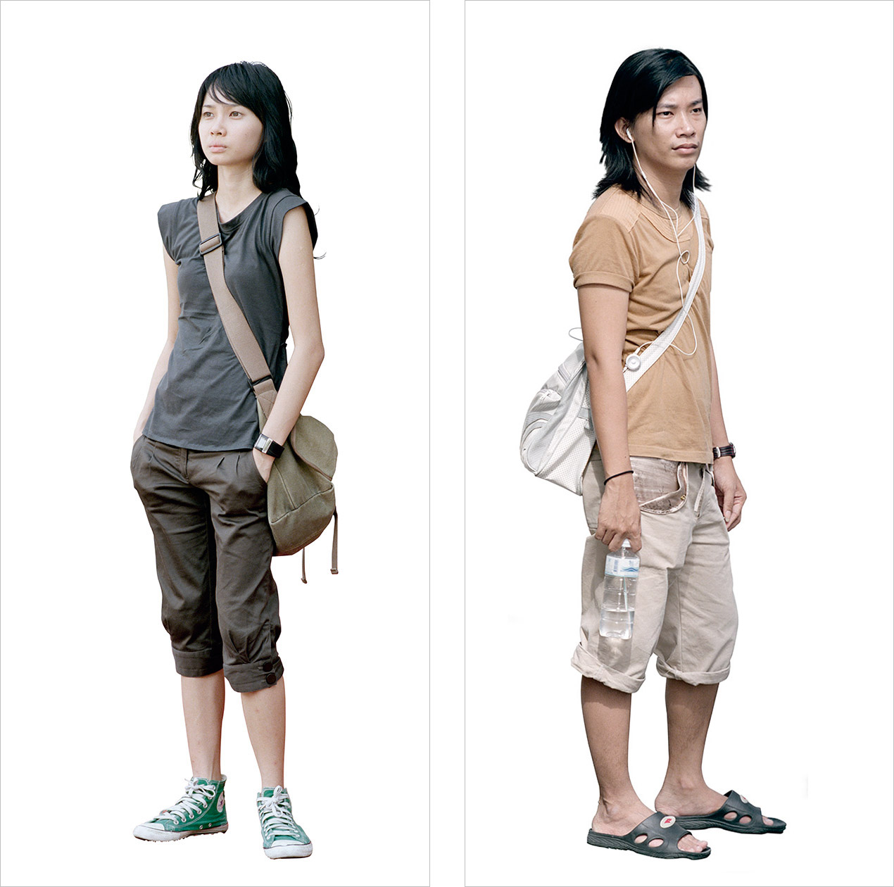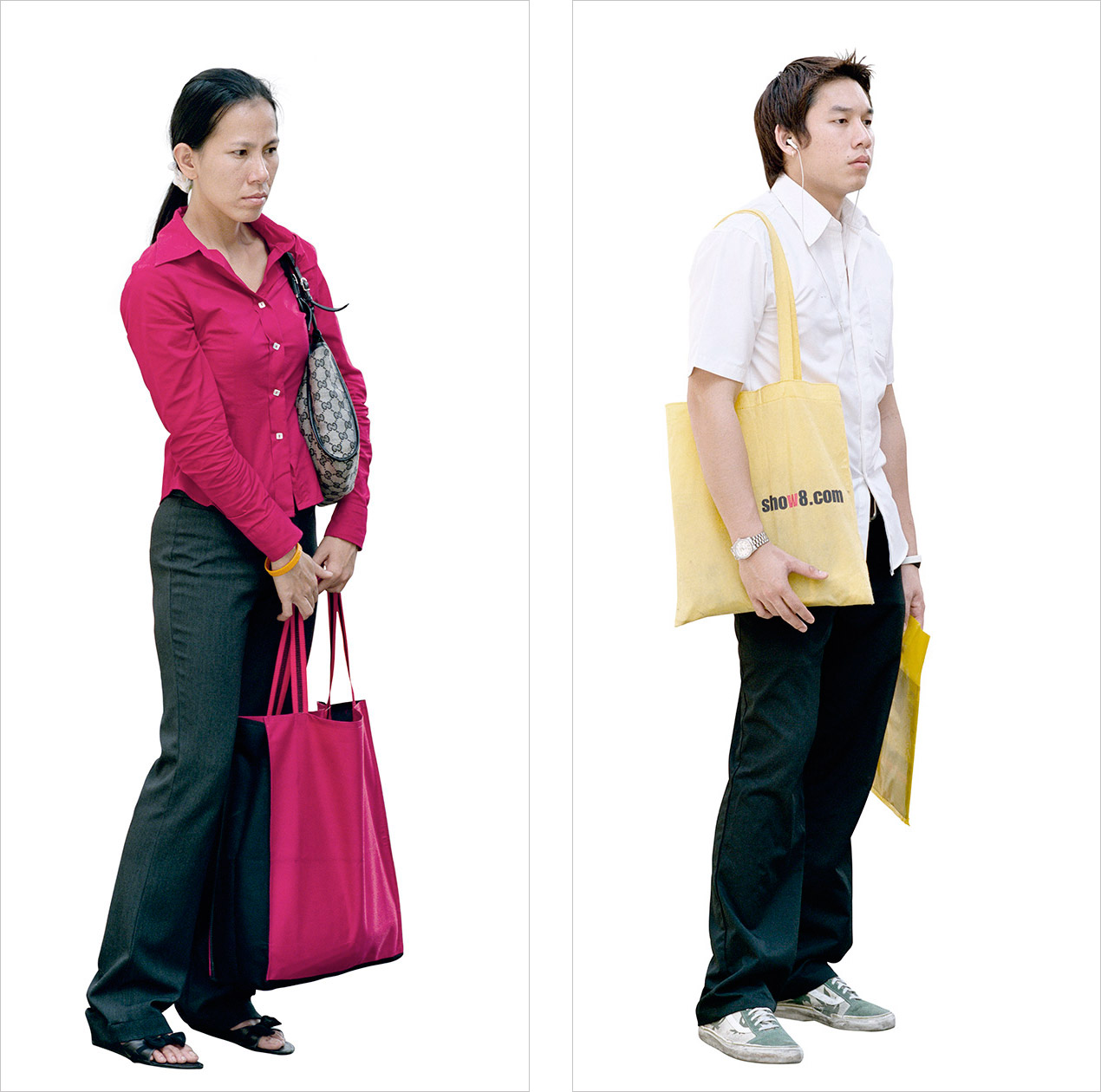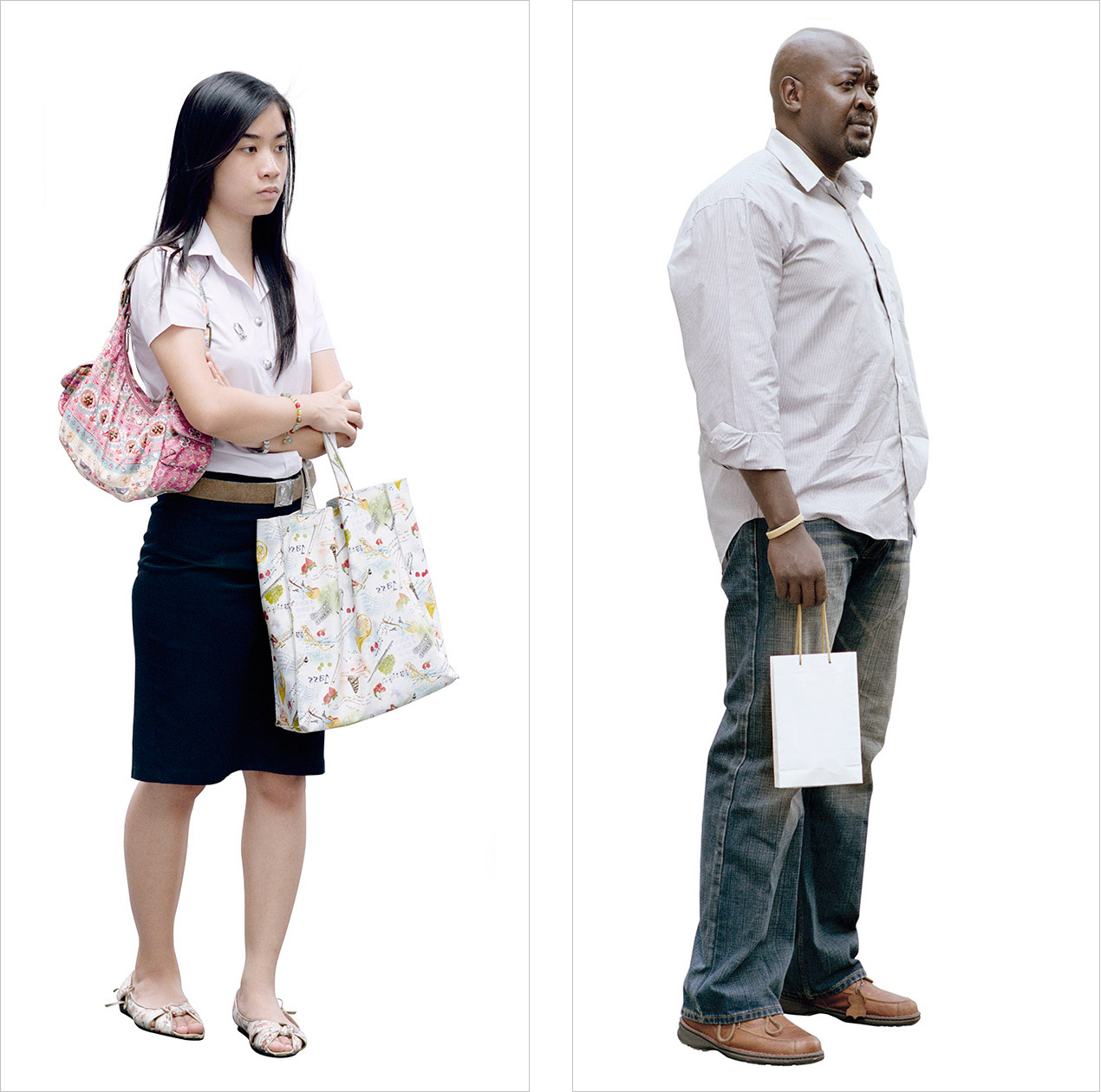 We see photographs of people on the streets of Bangkok and Singapore – but the actual street is not visible in the images. The persons appear isolated from the city space they are occupying – the city space has been taken away by the artist. We can only imagine the space and the geography of where the people are. This approach makes the postures, body shapes, clothing and accessories of the individuals all the more clear and interesting to reflect upon. Bellwinkel successfully takes an exciting and provocative approach to what at first may seem everyday subjects – not by using advanced digital technologies to manipulate his images but by pure reduction.