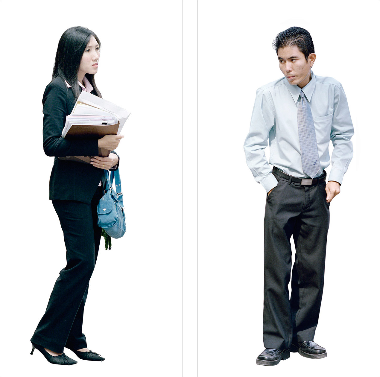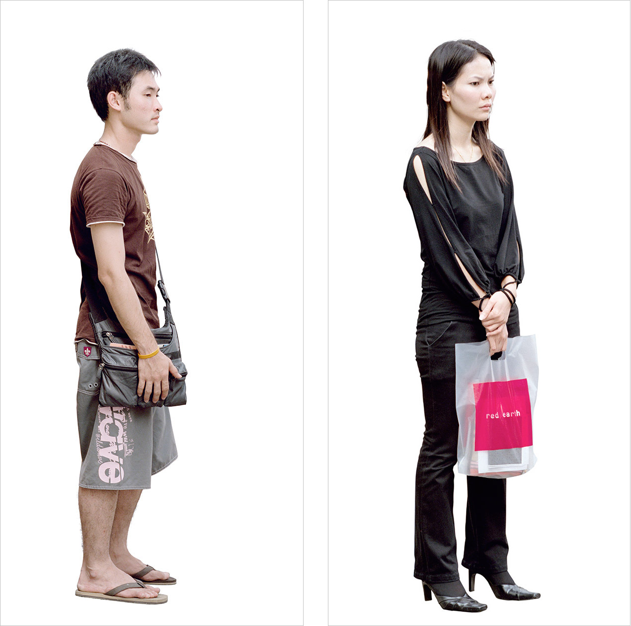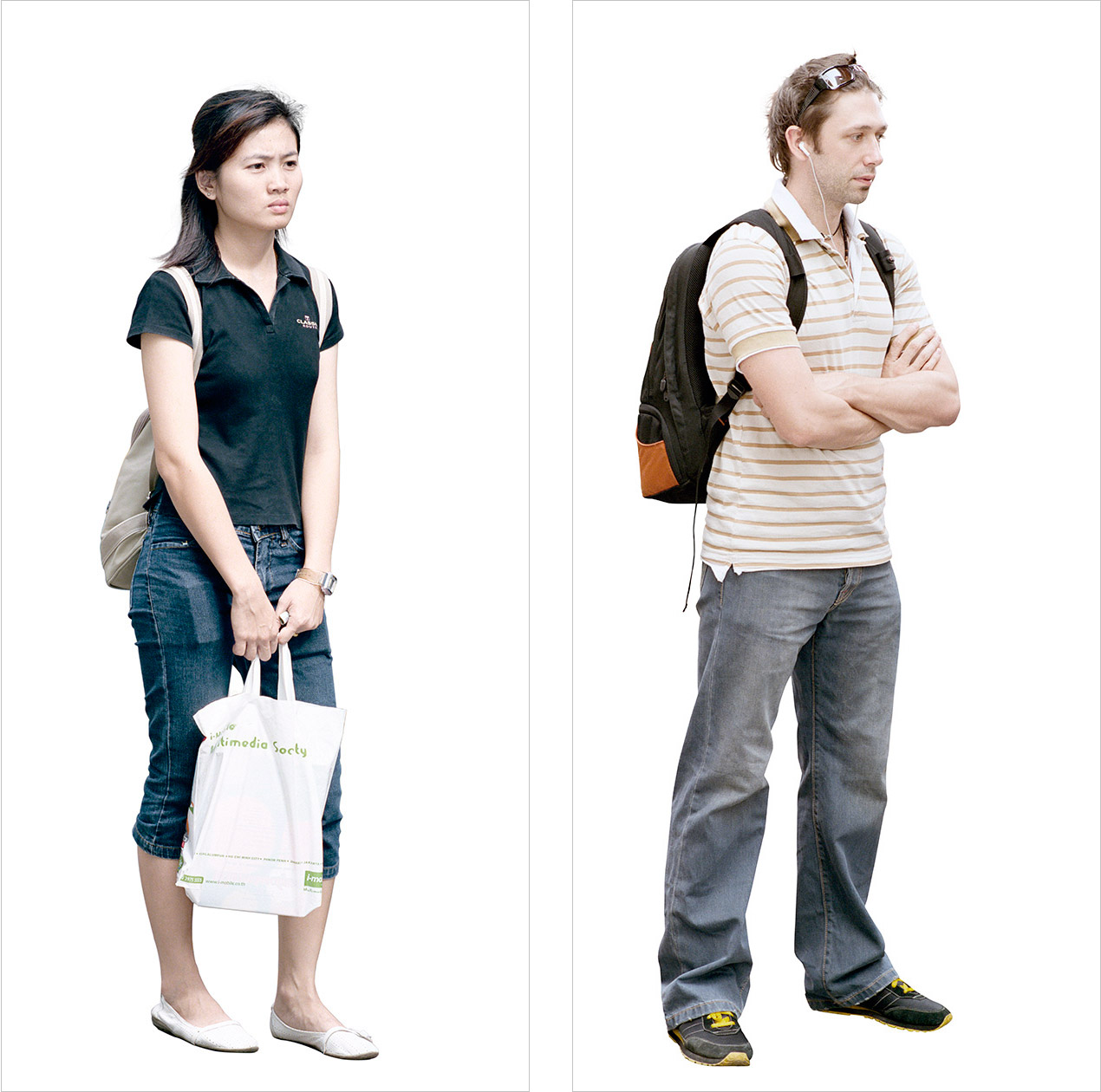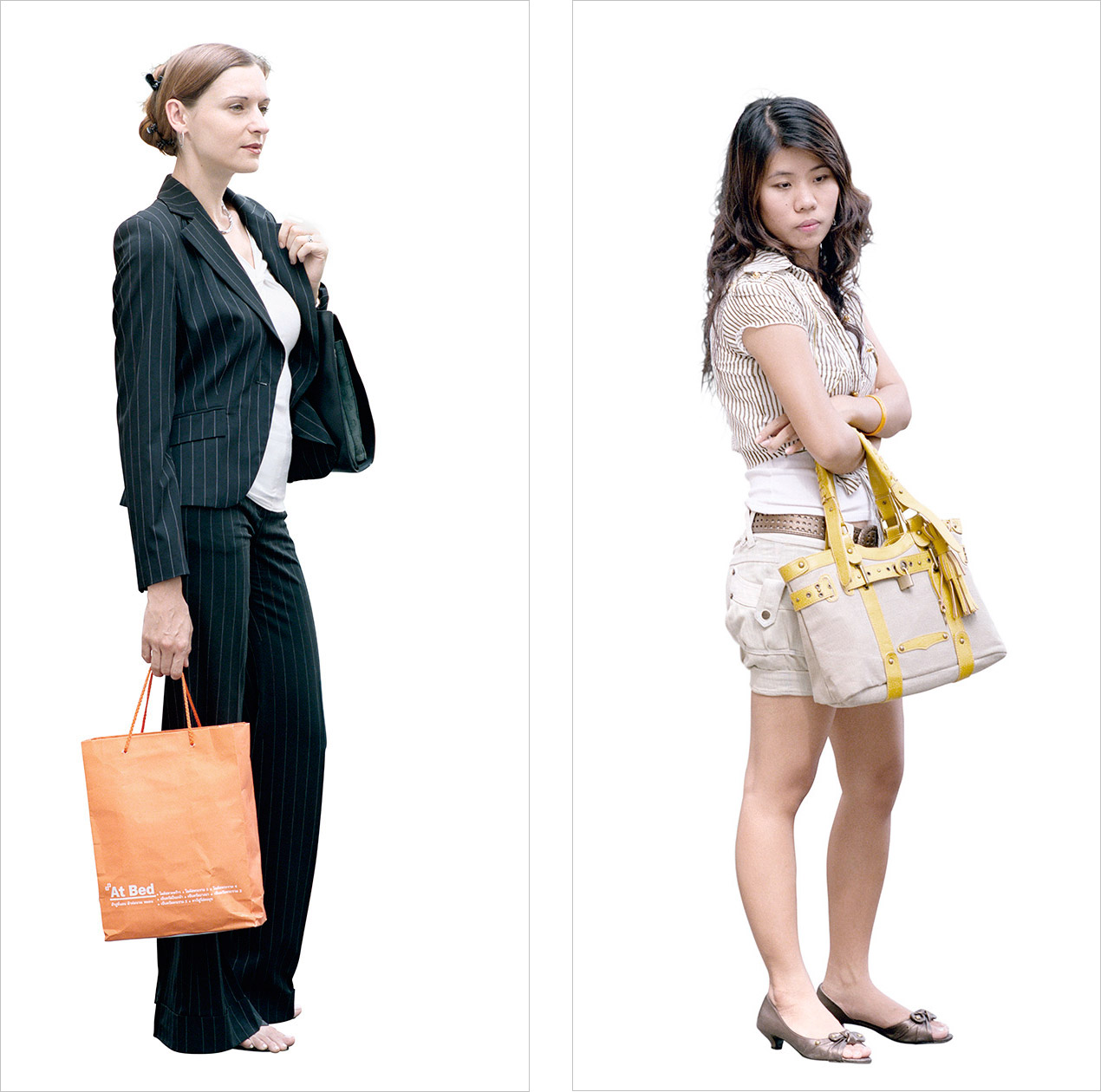 We see photographs of people on the streets of Bangkok and Singapore – but the actual street is not visible in the images. The persons appear isolated from the city space they are occupying – the city space has been taken away by the artist. We can only imagine the space and the geography of where the people are. This approach makes the postures, body shapes, clothing and accessories of the individuals all the more clear and interesting to reflect upon. Bellwinkel successfully takes an exciting and provocative approach to what at first may seem everyday subjects – not by using advanced digital technologies to manipulate his images but by pure reduction.