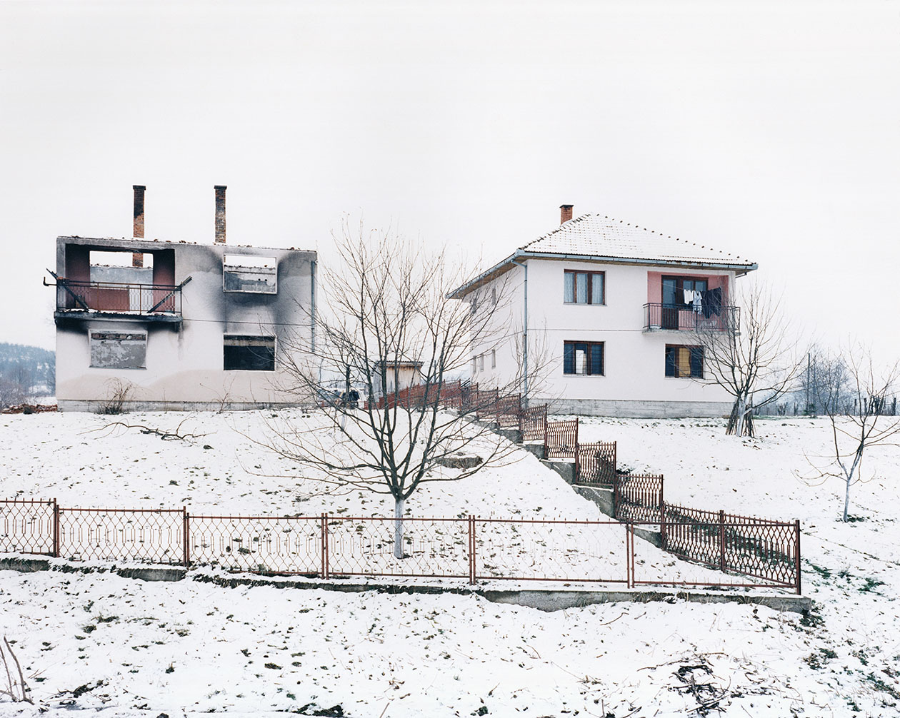 …Eine Winterlandschaft mit zwei nahezu identischen weißen Häusern: Während das eine intakt ist und die Wäsche auf dem Balkon zum Trocknen hängt, ist das andere komplett ausgebrannt. Zwei Schornsteine ragen wie mahnende Finger in den weißlichen Himmel. Wie eine kümmerliche Fabel von der Vergänglichkeit ist das jetzt ausgebrannte Haus aufwändig eingezaeunt.