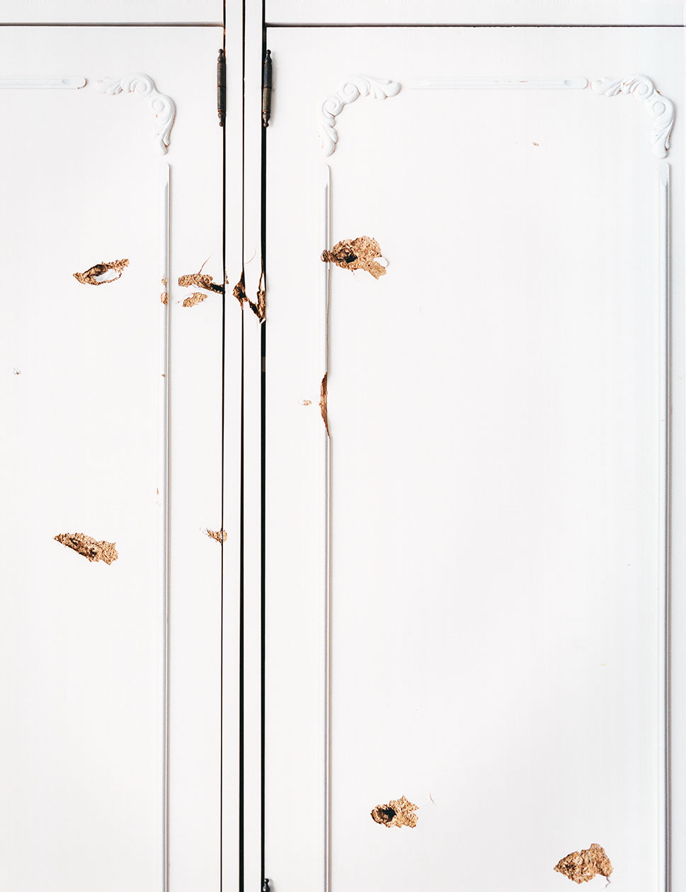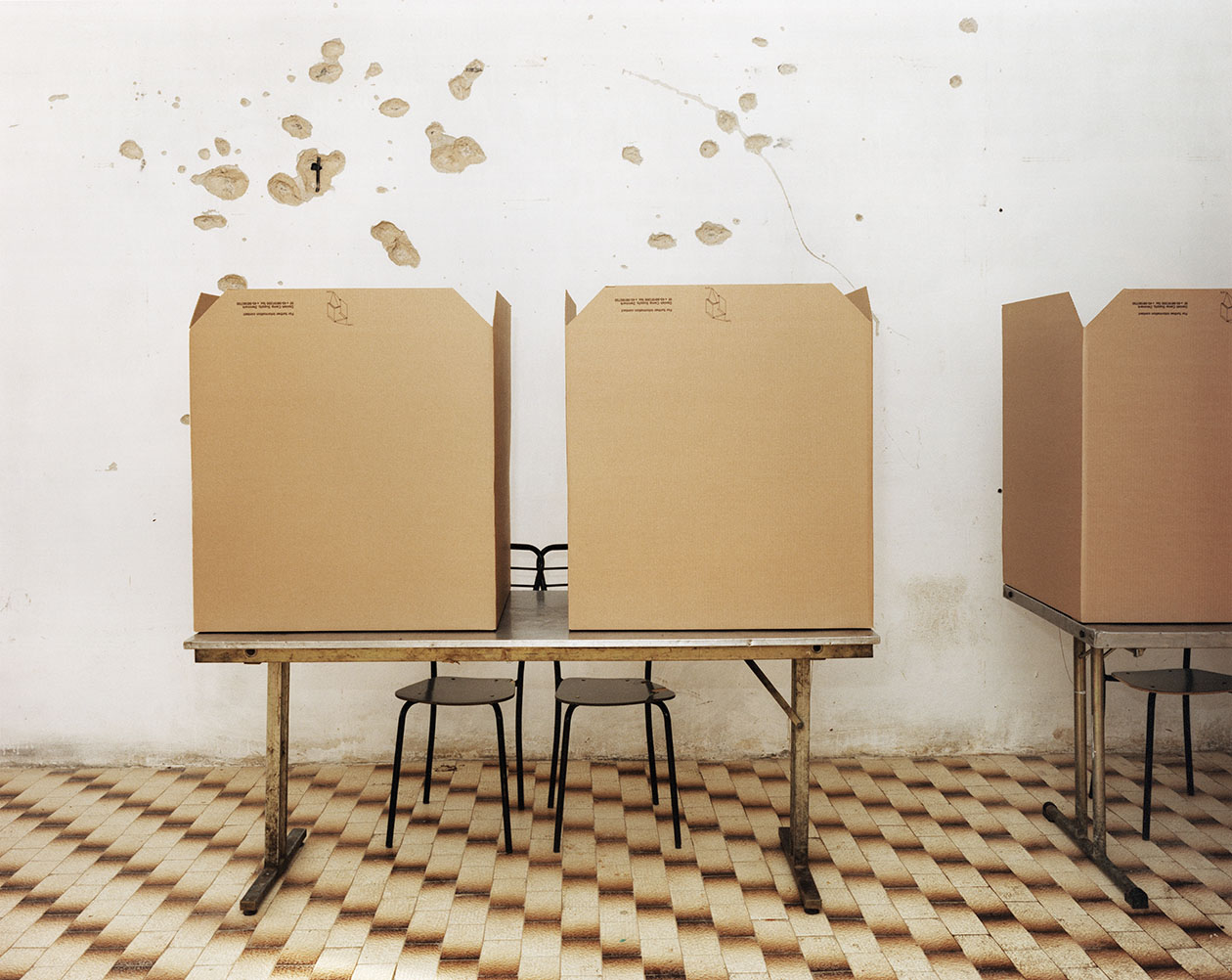 Eine andere Form schmerzhafter Symmetrie: Auf einem heruntergekommenen Schulpult hat man zwei eilig eingeflogene Standartkartons aufgestellt, die als Wahlkabinen dienen. Das Nebeneinander, die Pluralität, muss erst wieder erlernt werden. Die ruhigen Flächen des Kartons verweisen auf das unruhige Dekor des Fliesenbodens. Der Grund, auf dem Demokratie praktiziert wird, erscheint ungewiss.