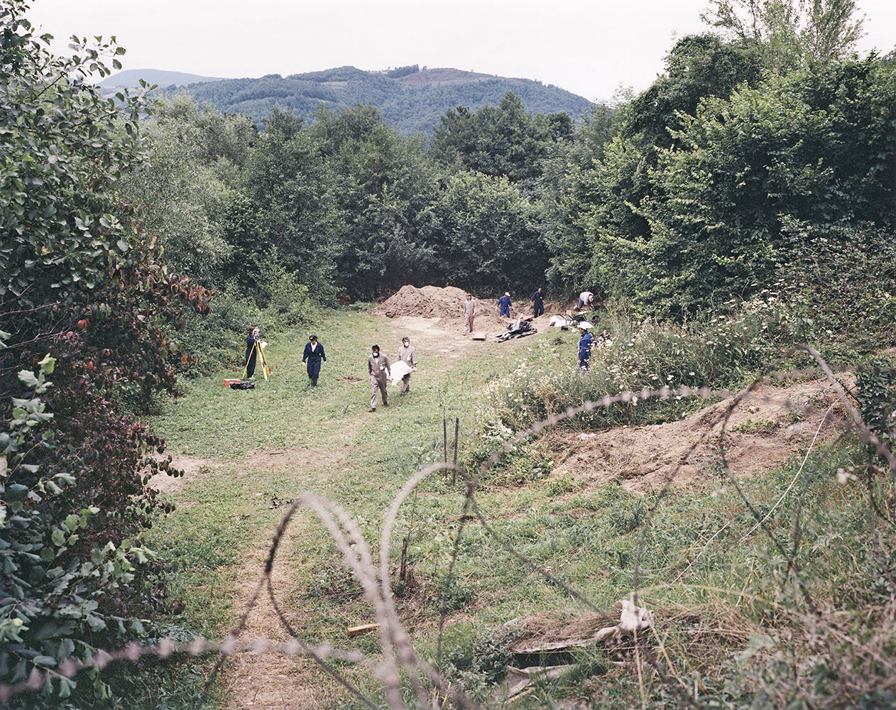A clump of bushes in a landscape so dry and desolate that it seems destined to be used as a dump is garlanded with bright bits of debris, red and yellow wires carried along by the wind until they come to rest on these naked branches. This vision of a possible magic blossoming, sublime and unknown is fogged by a feeling of woundedness, of spilled blood, of bodies dumped and abandoned. In a magnificent clearing, a group of people in blue and brown work clothes bustle around a pit without the viewer being able to see who is doing what. In the foreground, we glimpse a fuzzy image of barbed wire. Two of the figures, wearing protective masks, are carrying a stretcher with a corpse wrapped in a sheet. A third person watches. Another photographs the scene. What are they doing there? What have they found? Any interpretation seems possible.The scene is outside of time; the drama, though invisible is almost palpable. Yet we are looking at something very precise: a mass grave near Nova Kassaba.