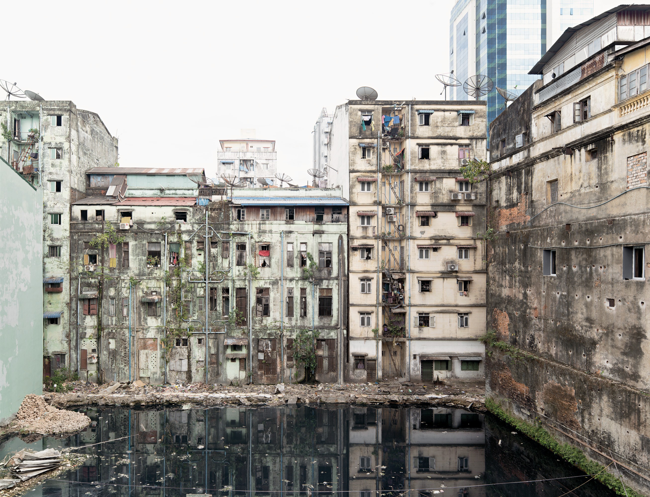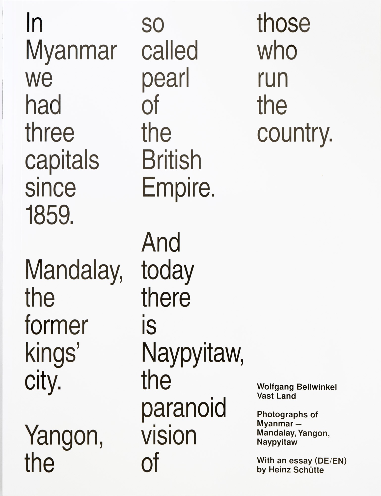 Seit 849 gab es 22 Hauptstädte und 39 Wechsel der Regierungssitze in Myanmar. Vast Land von Wolfgang Bellwinkel ist eine fotografische Studie der letzten drei Hauptstädte Myanmars: Mandalay (1857-1885), Yangon (1885-2005) und Naypyitaw (seit 2005). Alle wurden auf dem Reißbrett geplant, alle sind vom Machtanspruch und Selbstverständnis derjenigen gekennzeichnet, die sie errichteten. Bellwinkels Foto-grafien erzählen von einem Land, in dem sich seit der Mitte des 19. Jahrhunderts eine Tragödie an die nächste reiht: Koloniale Vereinnahmung, Welt- und Bürgerkriege, Naturkatastrophen, Militärdiktatur, ethnische Konflikte, Vertreibungen. Im Gegensatz zur Dramatik und Dichte der Ereignissen sind Bellwinkels Arbeiten nüchterne und präzise Fotografien, mit denen er den Charakter und die verschiedenen Zeitschichten der drei Städte freilegt. Ergänzend zu den Fotografien vermittelt der 20-seitige Essay des Soziologen Heinz Schütte einen vertiefenden Einblick in die Geschichte und Gegenwart der vorgestellten Städte.